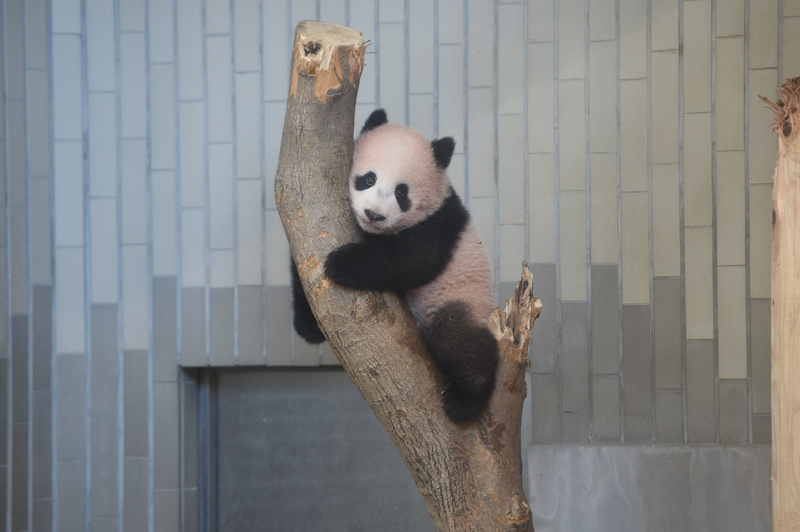 シャンシャンは1~2時間起きていたあと2時間ほど眠るといったペースで活動しており、起きているときは室内展示場をあちらこちらへ歩いたり、設置されている木やドアの格子に登ったりするなど、盛んに動き回っています。