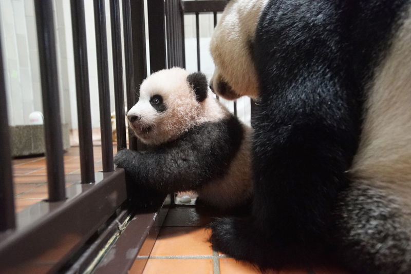 後ろ足の力はさらに強くなり、四肢で歩く行動範囲はさらに広がるともに、柵などに前足をかけて二足で立つ姿も時折見られます。周囲の様子を見る目の動きもよく確認でき、徐々に見えてきているようすが伺えます。また、上下左右の犬歯に加え、前後の臼歯など他の歯も生えてきていることが確認されました。歯が生えてくるにともなって、母親に与えているタケや産室の柵をかむ姿も見られます。