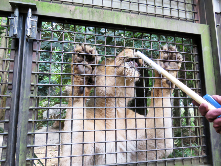 たとえば、ターゲット棒を動物の前に差し出し、棒の先端に鼻先をつけたらクリッカーを鳴らし、馬肉を与える──これを繰り返すこと、動物は自発的にターゲット棒に鼻先をつけるようになります。この条件付けを利用して、トラやライオンを目的地点に誘導したり、特定の姿勢が維持できるように訓練したりします。