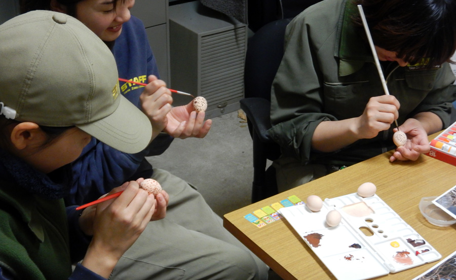 短時間で固まった樹脂を型から取り出し、ヤスリで磨きをかけた後は色付けです。本物の卵に似るか否かは、この色付けで決まります。2016年に生息域内で撮影したライチョウの卵の写真を参考に、9名の職員で色付けに挑戦しました。この擬卵をメスが気にいってくれるかどうか……結果は繁殖期後に報告します。