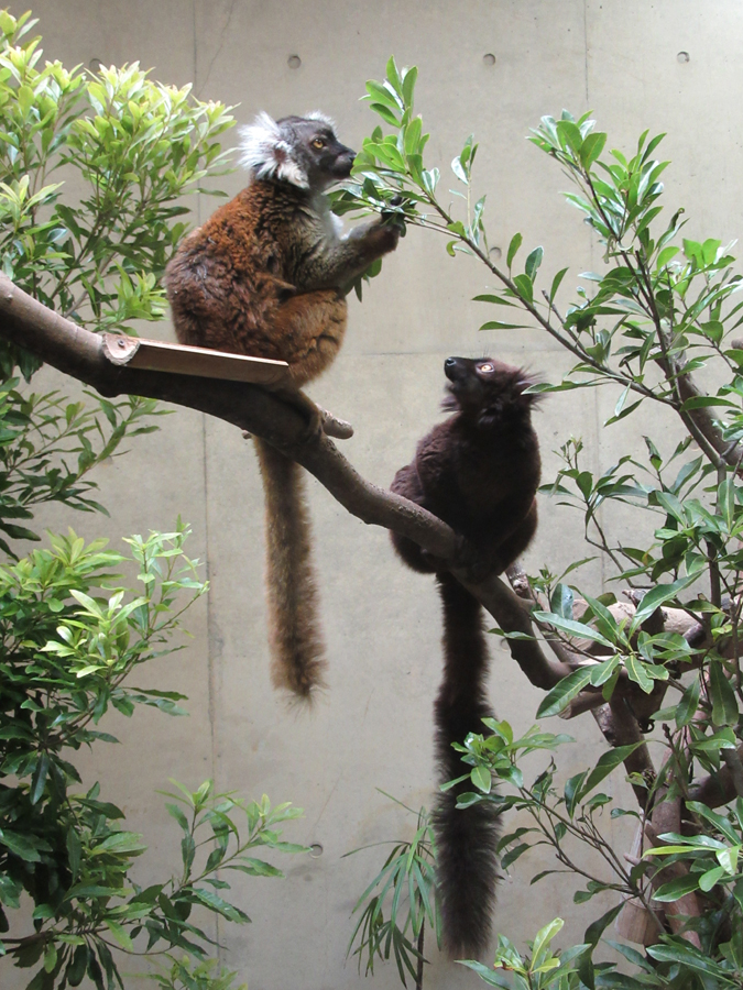 上野動物園西園にある「アイアイのすむ森」では、クロキツネザルのペアを一般財団法人進化生物学研究所から借り受け、2017年1月から公開しています。クロキツネザルを迎え入れて飼育する中で感じたのは、「雌雄の仲がいい」ことです。木の上で休むときはいつも2頭が寄り添い、オスがメスを後ろからそっと抱えるようにしています。給餌のとき好物の果物をめぐって争うようなことはありません。「オスとメスのペアなら、仲がいいのは当たり前では?」と思われるかもしれませんが、キツネザル界ではそうとも限りません。