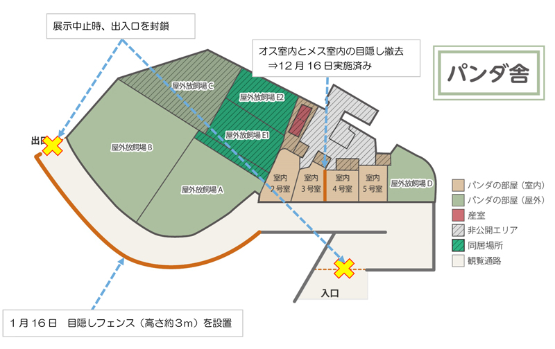 同居させる状況になったと判断した場合には、開園日であっても、ジャイアントパンダの展示を終日中止し、パンダ舎内の観覧通路からもご覧いただけなくなります。
