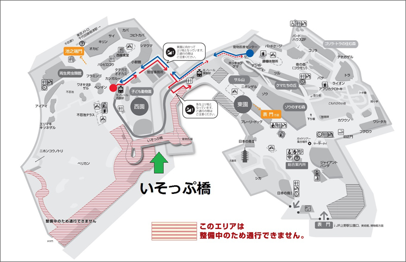 東園から西園へ(青矢印) 動物医療センター脇から臨時通路へ進んでください。