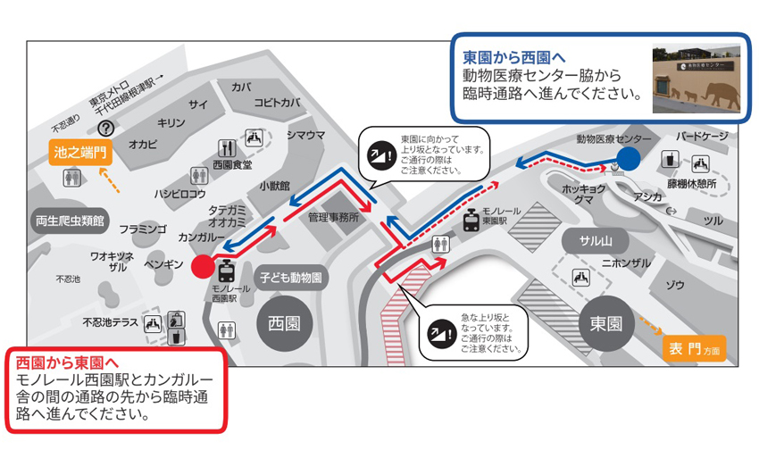 東園と西園の間を移動する際は、以下の図のとおり、臨時通路をご利用ください。