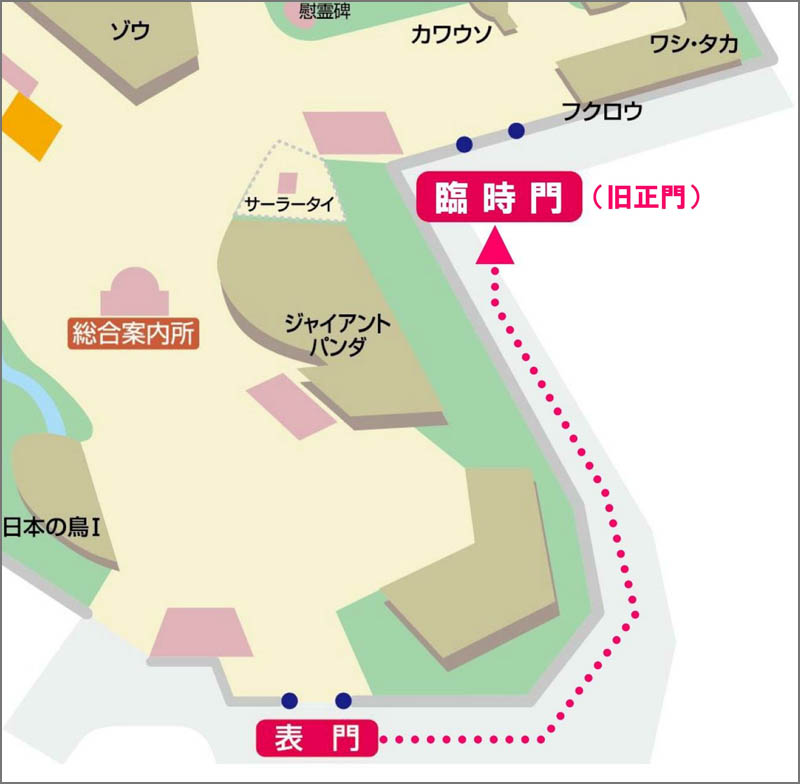 下記地図のとおり、表門に向かって右折し、上野動物園の外周に沿って進むと臨時門(旧正門)があります。表門から徒歩約3分で到着します。