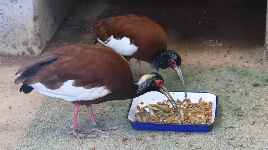1羽は西園の「水禽舎」で公開していた推定10歳のおとなのオス。2014年に水禽舎を取り壊した後、非公開エリアで飼育していました。もう1羽は、親が卵を温めなかったため、自分でえさを食べるようになるまで孵化直後から飼育係が育ててきた1歳7か月の若いオスです。