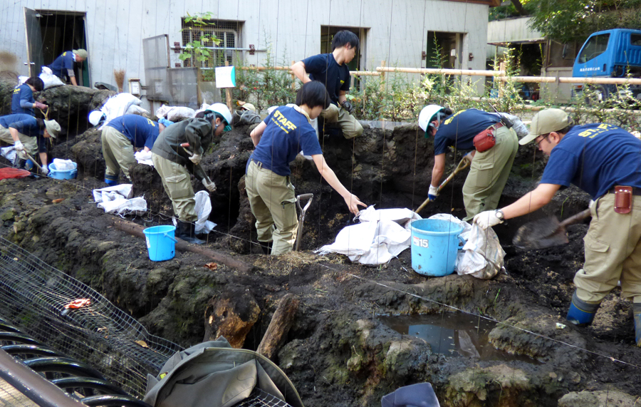 放飼場の土入れ替えは、残った個体の捕獲作業もかねています。土を掘り出す際は、残っている個体をケガさせないように慎重に進めなくてはなりません。朝10時から土入れ替え作業を開始し、夕方4時に全個体の捕獲と土の入れ替え作業が終了しました。10時以降の作業は上野動物園職員総出でおこない、一日がかりで終えることができました。