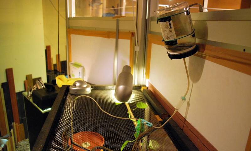 そこで特設展の展示では自家製の装置をセットし、水をたえず落とすことによって、水の存在に気づかせ、いつでも飲めるようにしているのです。また、ケース内に霧吹きをしたり、直接スポイトから飲ませたりしています。