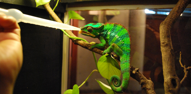 カメレオンのなかまを飼育するとき、水を確実に飲ませることはとても大事で、これができないと弱ってしまい、最悪の場合、死にいたることもあります。