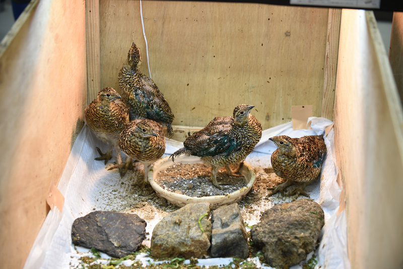5羽の若鳥たちは、鳥を育てるための専用の「育すう箱」の中で一緒にくらしています。東京は猛暑ですが、高山に生息しているライチョウのために室温は約20℃に保ち、病気にならないよう、飼育担当者は衛生管理に細心の注意を払って飼育しています。