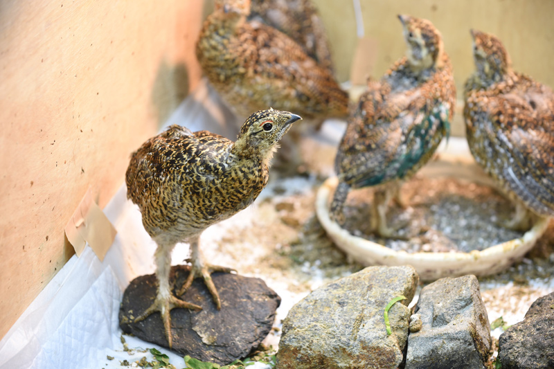 ライチョウたちは、東園のライチョウ孵化施設(非公開)で元気にすくすくと育っています。体重も205.5~253.5グラム(8月1日現在)と孵化した時の10倍以上になりました。