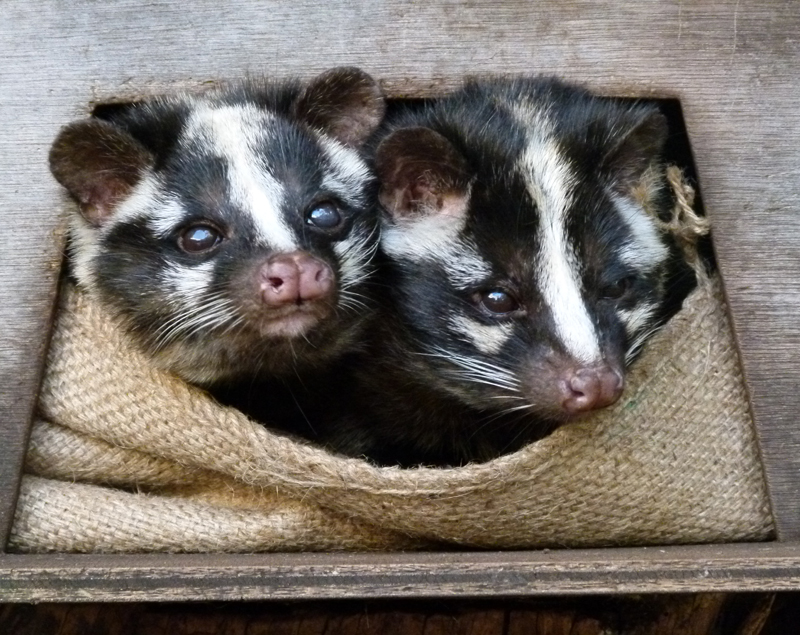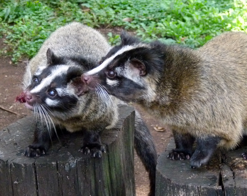 上野動物園には東園のマレーグマ舎にハクビシンがいますが、西園の子ども動物園にもハクビシンがいます。子ども動物園のハクビシンは3頭。その中でも、そろって見られるのがメスの「ミニ」とオスの「マム」です。害獣として知られているハクビシンですが、じつは子ども動物園ではちょっとした人気者です。