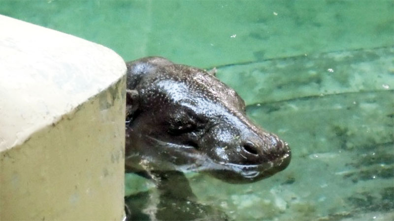コビトカバの室内プールの水温は20~22℃ほどにしてあります。とくに寒い日は、放飼場から寝室に戻ったコビトカバは、えさも食べずにすぐにプールに入ります。暖かい水に入り、目を半開きにしながら、気持ちよさそうにじっとしていることもあります。その姿は、まるで温泉にのんびりつかっているようです。