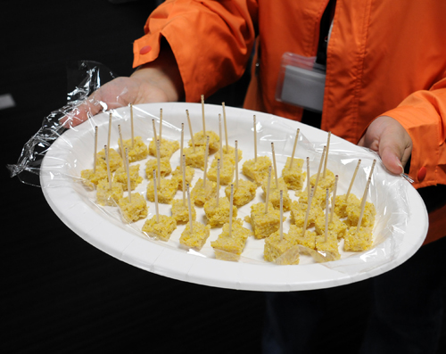 お話の途中で、パンダの竹の食べ残しやフンが室内に登場すると、どなたも興味津々なようすで竹を触ったり、フンのにおいを嗅いだりしていました。そして今回は特別に……いつもジャイアントパンダが食べている「パンダ団子」をアレンジし、人間用の材料で作った団子の試食会です。口にした参加者の方から「意外においしい」「素朴な味」などのご感想をいただきました。