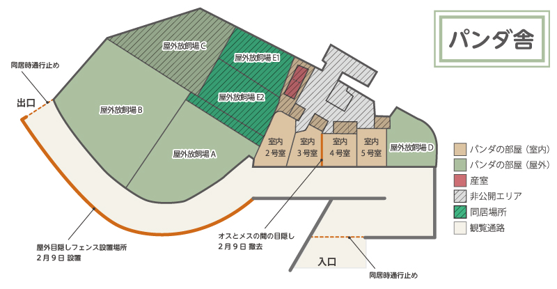 上野動物園では2頭の同居を視野に入れ、円滑に進めるために事前の準備を進めます。それにともない、どちらか1頭のパンダが見られなくなる場合があります。また、同居させる際には、開園日であっても2頭の公開を中止しますので、あらかじめお知らせします。