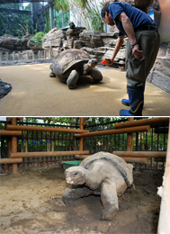 体が大きいガラパゴスゾウガメは飼育するのに広い敷地が必要です。また、タロウとカメ吉を同居させるとケンカをしています。そこでふだんは、タロウのみを室内で展示し、カメ吉は非公開の場所で飼育しています。