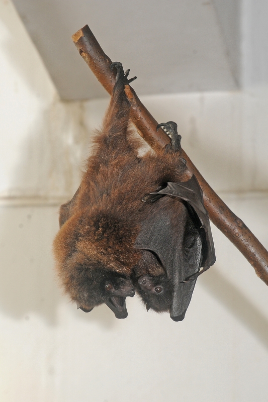 沖縄に住むオオコウモリで、果実が主食です。小型コウモリと違って超音波は使わず目で見て空を飛びます。上野動物園では西園の小獣館で飼育しています。