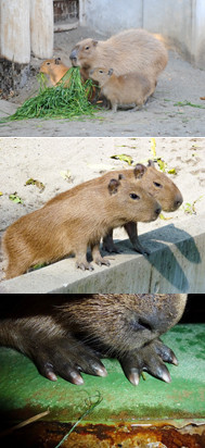 写真上:放飼場に出たカピバラの親子
