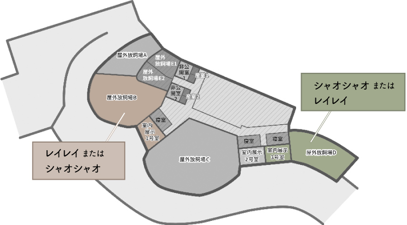 シャオシャオとレイレイの展示場所の変更に伴い、室内展示場所が1号室から2号室になります。屋外放飼場所は変更ありません。