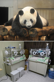 そこで近年は双子を産んだ場合に、1頭をいったん人が取り上げて保育器で育て、その間もう1頭は母親に育てさせ、途中で子どもをオリの間から交換し、母親に同時に2頭を育てさせるという方法をとるようになった。