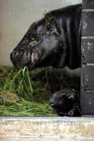 同居から214日目の2011年6月22日朝、飼育担当者が誕生した子ども1頭を確認し、同じ日のうちに授乳を確認しました。子どもは母親の「エボニー」にピッタリとくっついて甘えていますが、生まれて数日も経たないうちに、元気良く歩き回ったり泳いだりしています。お乳を吸う力も強くなってきており、時々「エボニー」の真似をして、青草を口に入れることもあります。