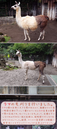 ──その結果、カリスマ美容師とは程遠い飼育係によって、みごとにアシンメトリーに刈られたラマが見られます。2頭とも体の左側はきれいに刈られているのですが、右側が……。言い訳もあるのですが、理由は看板を作って貼っておきます(写真をクリック)。右腹の毛の長いところなど、なかなかオシャレだと思うのですが。