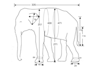 体格測定は背の高さばかりでなく、体のさまざまな部位を測ります。ここで2011年3月27日に測定した上野動物園で一番大きいメスゾウ「ダヤー」(34歳)の測定記録をご紹介します。詳しい部位と測定値は、図をごらんください(単位はセンチメートルです)。