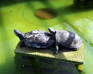 写真は、草食ではなく、肉食寄りの雑食である2種のカメ。左がミシシッピアカミミガメ、右はミナミイシガメ。