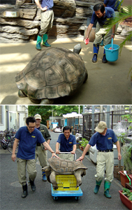 2009年7月30日、上野動物園の両生爬虫類館の室内にいたガラパゴスゾウガメのオス「タロウ」を屋外展示場に移しました。夏のあいだは屋外の気温も高いので、日光浴がてら毎年外に出しています。