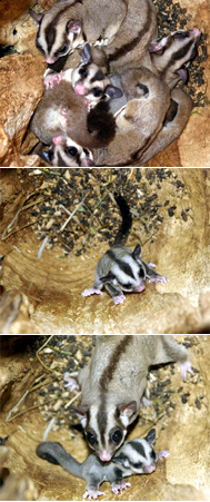 上野動物園西園にある小獣館の地下では、さまざまな夜行性の哺乳類を飼育・展示しています。今から約1か月前(2009年4月下旬)、ここでフクロモモンガの子どもが出袋(しゅったい)しました。おとなのフクロモモンガはやや茶色がかった色をしていますが、子どものうちは灰色っぽい色をしています。写真上をごらんください。真ん中に小さく写っている子どもがおわかりになりますか?