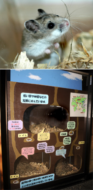 室内のリフォーム完了後、飼育係の手作りの解説をイラストなども加えてガラス面に掲示して完成。野生のハムスターは地中にトンネルを掘り、単独で生活します。トンネルを再現するのは大変なので、わかりやすい絵を描きました。寝床やトイレ、貯蔵庫など、ハムスターが地中に作るさまざまな部屋もイラストで説明してあります。