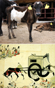 江戸時代の絵巻物や浮世絵に描かれた牛の絵を見ると、古来の在来牛は、白斑をもつ小型の牛だったと推測されます。たとえば、平治物語絵巻に描かれた牛車をひく牛にその特徴が見られます(写真下)。