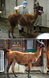 上野動物園の子ども動物園では、2008年7月7日午前、ラマのラーマ君(オス、9歳)の毛刈りをしました。例年6月中に実施していましたが、うっかり7月になってしまい、暑さもきびしくなってきたので、梅雨空のあいにくの天気でしたが、毛刈りをおこないました。