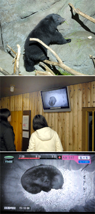 冬眠中のクマは体温が下がり、呼吸数や心拍数が減るとともに、餌や水を口にしなくなり、排泄や排尿も見られなくなります。こうした変化を把握するために、首都大学東京の協力を得て、冬眠室には呼吸数と心拍数を測定する装置(マイクロ波によって、体にふれずに測定することができる)、および暗視カメラを設置し、すべてをコンピューターに記録するようにしました。