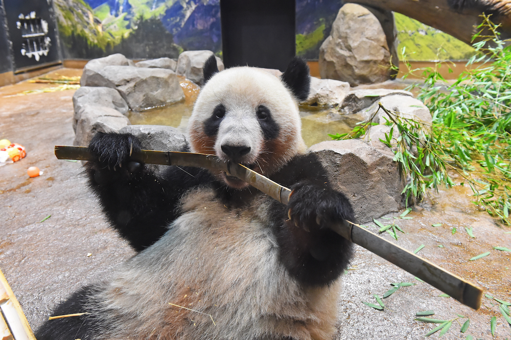 えさとしてモウソウチク、シノダケ、マダケなどのタケを中心に与えており、副食であるパンダ団子、ニンジン、リンゴもそれぞれ必要に応じて与えています。