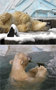 写真下は、プールにつかって食事中のホッキョクグマです。手にしているのは「ワカメ」。ちなみに、食べるとそのまま出てくるとか。腸に良い?