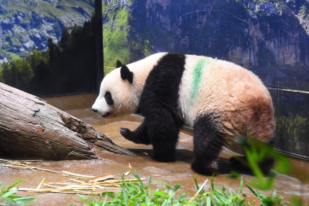 夜間のようすなどをビデオの録画映像で確認する際や監視カメラの映像で個体を明確に識別するため、シャオシャオの背中に印をつけています。この印を気にするようすは見られません。
