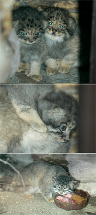 2004年4月6日、小獣館のマヌルネコが2頭を出産! 性別は不明です。体長は約20センチ。最近、巣箱から出て、ヒョロヒョロと歩くすがたが見られるようになりました。