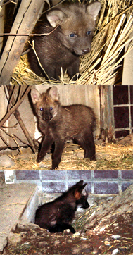 2004年1月26日、「東京ズーネットBB」では、タテガミオオカミの母「コンチャ」と赤ちゃんの動くすがたを公開しました。撮影は飼育担当者。やはり、この時期、担当者でなければ近よれません。右の写真は、ビデオ撮影時よりも大きくなった赤ちゃんたちです。
