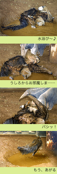 放飼場に穴を掘り、上から水道のシャワーをふらせて、プールにしたところ、ジャボンとつかるようになりました。