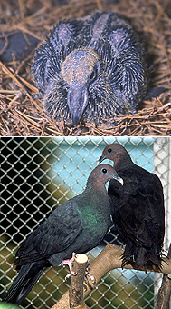 上野動物園では、2001年3月に小笠原諸島の父島で捕獲したアカガシラカラスバト3羽(オス2羽、メス1羽)の飼育を続けてきました。このたび、はじめてペアリングに成功!