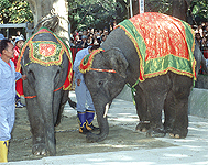 東園五重塔の前で午前10時から開かれた式典には、日本とタイの関係者が出席。その後、おおぜいの来園者がとりかこむゾウの放飼場に、あざやかな衣装をまとった2頭が登場しました。