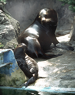 カリフォルニアアシカは、表門から入ると東園のずっと奥、売店のそばの池にいます。おとなは4頭。一夫多妻で知られるとおり、オス1頭、メス3頭のくみあわせです。アシカ類は雌雄で体の大きさがちがうのが特徴で、4頭のうち、いちばん大きいのがオスの「ジョン」(6歳)。体の色がすこしうすいのが最年長の「カツコ」(15歳)。