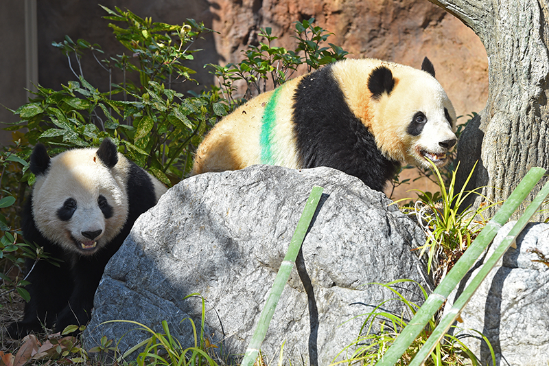 初めて屋外放飼場Dに出たレイレイ(左)とシャオシャオ(右)