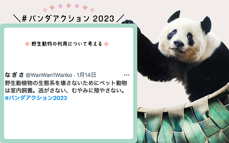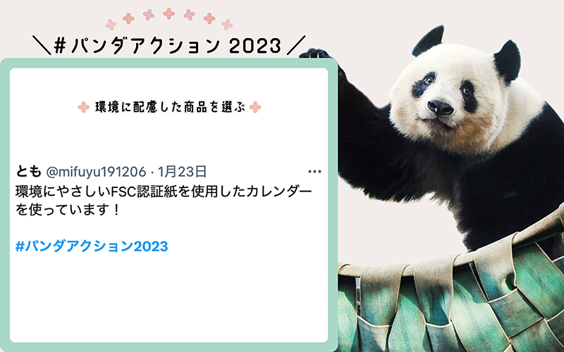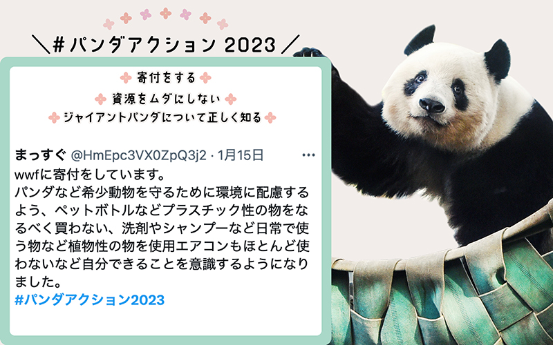 こちらでお知らせしたとおり、2023年1月11日(水)〜2月26日(日)にみなさまが実践した「#パンダアクション」(野生のジャイアントパンダを守るための取組み)をTwitterに投稿していただくように呼びかけたところ、とても多くの方からご自身の「パンダアクション」を投稿していただきました。