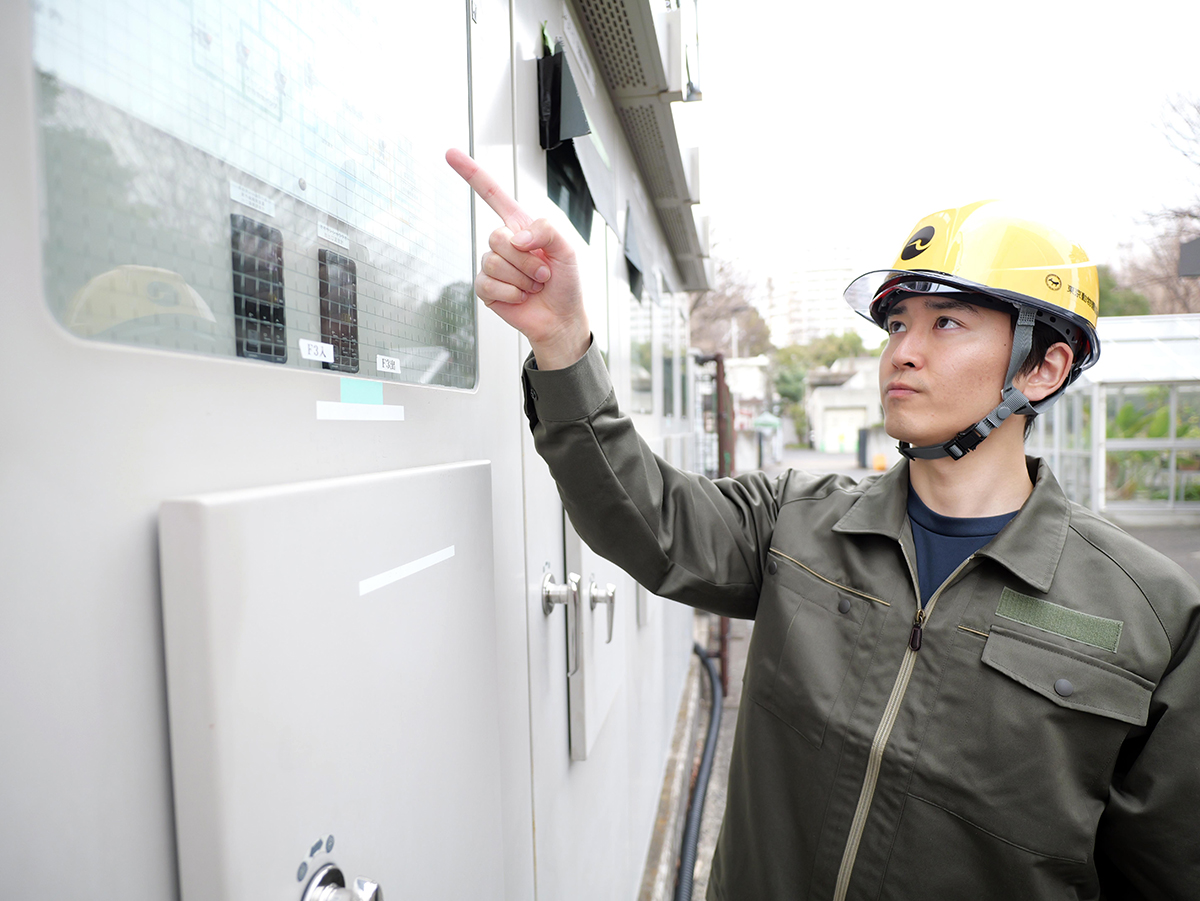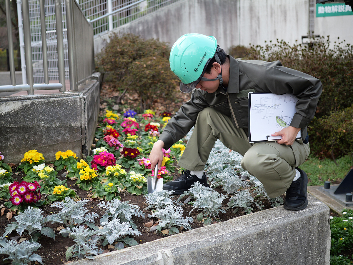 施設維持管理部門では、施設や設備を適切に保守管理し、お客様の安全確保や展示動物の生息環境を維持するため、日々園内施設の維持管理業務を行っています。具体的には、動物舎や電気・機械設備の維持管理、園内樹木や花壇の整備などに携わります。自身の専門分野に限らず、幅広い業務を経験できるのも魅力のひとつです。また、他部門の職員やお客様と接する機会もたくさんあります。