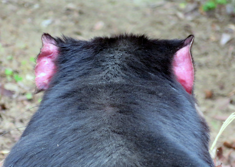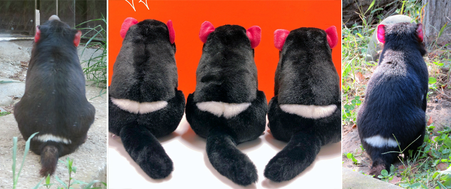 表情上,眼睛吊起來卻很可愛,令人睏擾的眉毛,嘴巴露出的小尖牙。在胸部和臀部加上白色的點,就變得很像惡魔了。我決定把耳朵變成“兩面深粉色”。魔鬼的耳朵沒有厚度,正面和背面的頭發都很薄,所以當陽光照射或體溫升高時,它看起來從淺粉色變為紅色。這個紅色的耳朵也是魔鬼的一個主要特徵,所以我認為我必須表達這個。